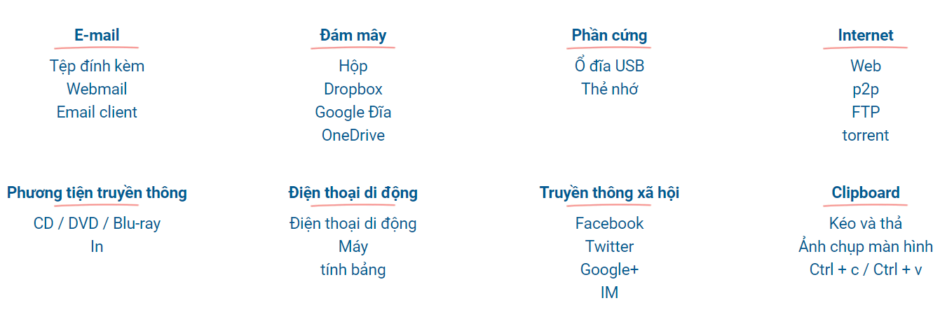 | Bảo vệ dữ liệu trên môi trường email và network Bảo vệ dữ liệu khi chia sẻ qua email, các ứng dụng mạng như: upload qua web [fshare, we stransfer…]; các loại tin nhắn tức thời [facebook, viber, zalo, skype…]; và chia sẻ qua mạng |